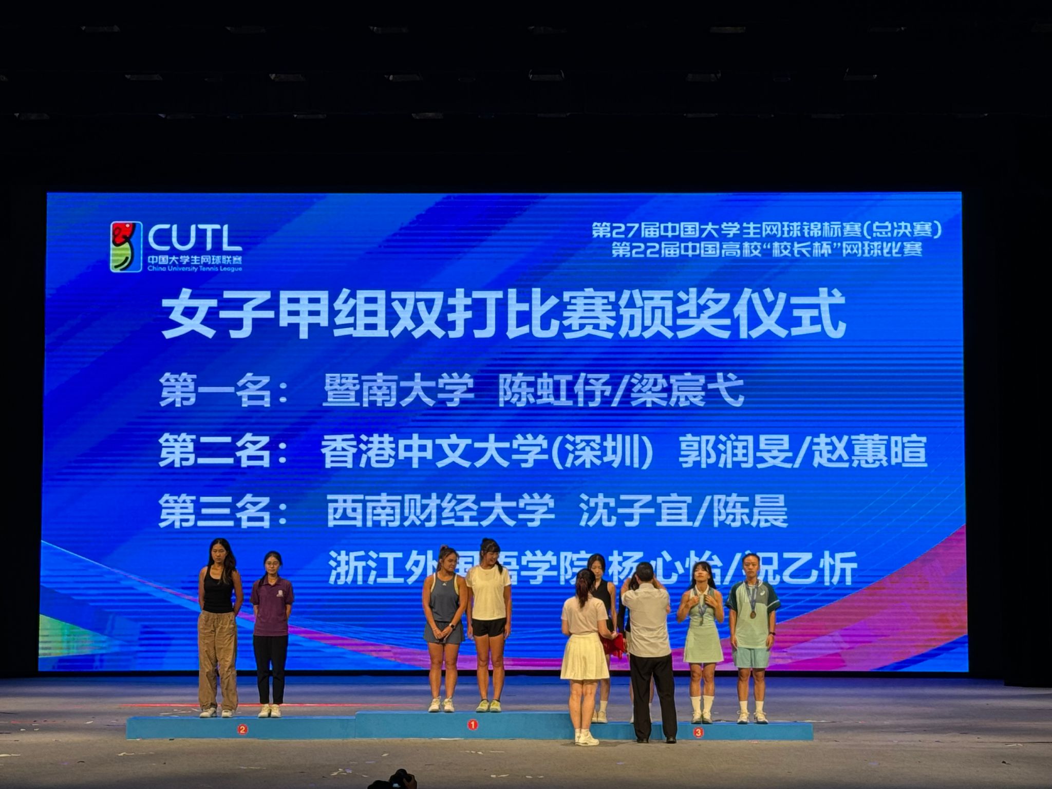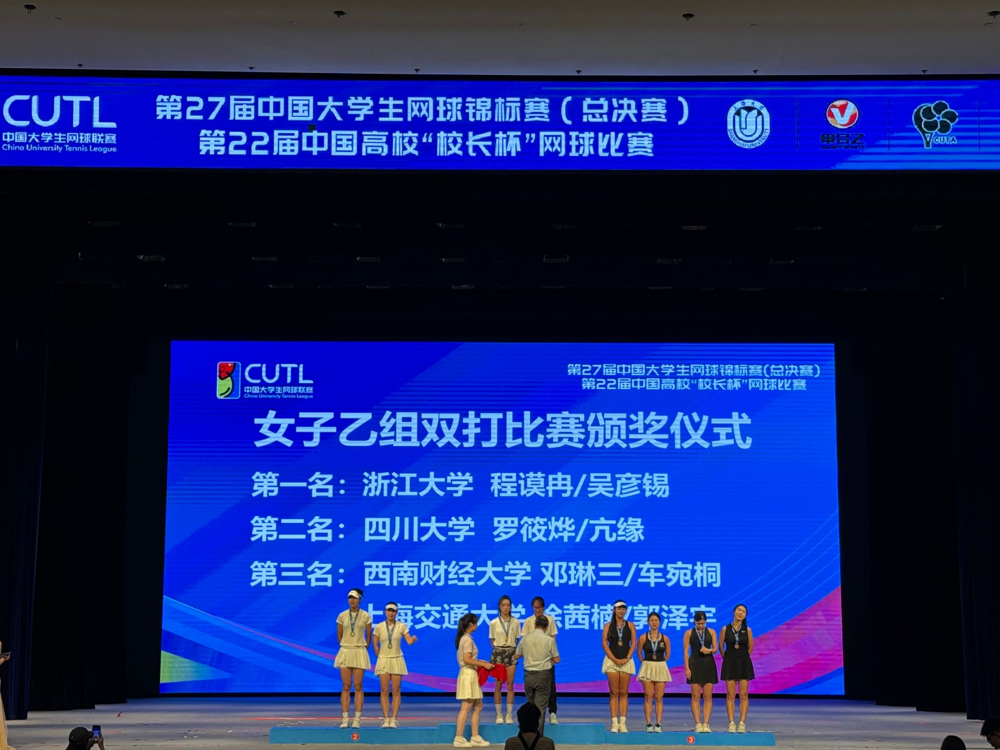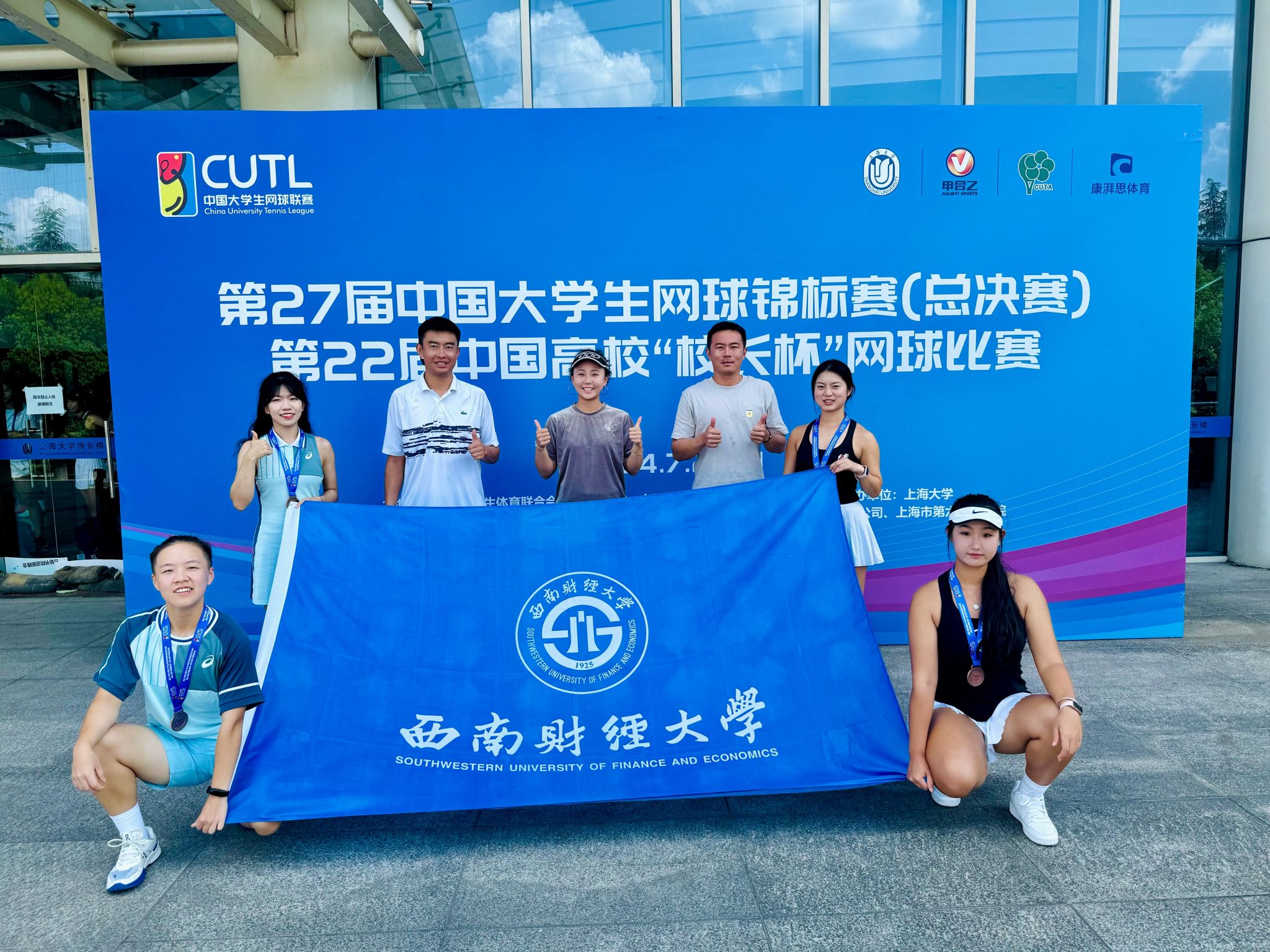 7月22日-8月1日,第27届中国大学生网球锦标赛(总决赛)在上海大学(宝山校区)举行。中国大学生网球锦标赛是我国大学生层面最顶级的网球赛事,经过八大分区赛的激烈角逐,在本届中国大学生网球锦标赛(总决赛)中,共有来自全国132所高校的915名同学成功晋级总决赛。参赛规模创历史新高!完美体育在线(中国)唯一官方网站网球队在前期分区赛上表现突出,成功晋级总决赛,11名运动员代表学校参赛,孙巨杉、施泓宇、孔星宇担任教练。经过八天的激烈角逐,西财健儿们在强手如林的赛场上顽强拼搏,团结奋进,获得女子普通高校甲组双打季军和女子高水平乙组双打季军的好成绩,充分展现了西财学子的精神风貌和青春风采,为即将到来的西财百年华诞献礼!