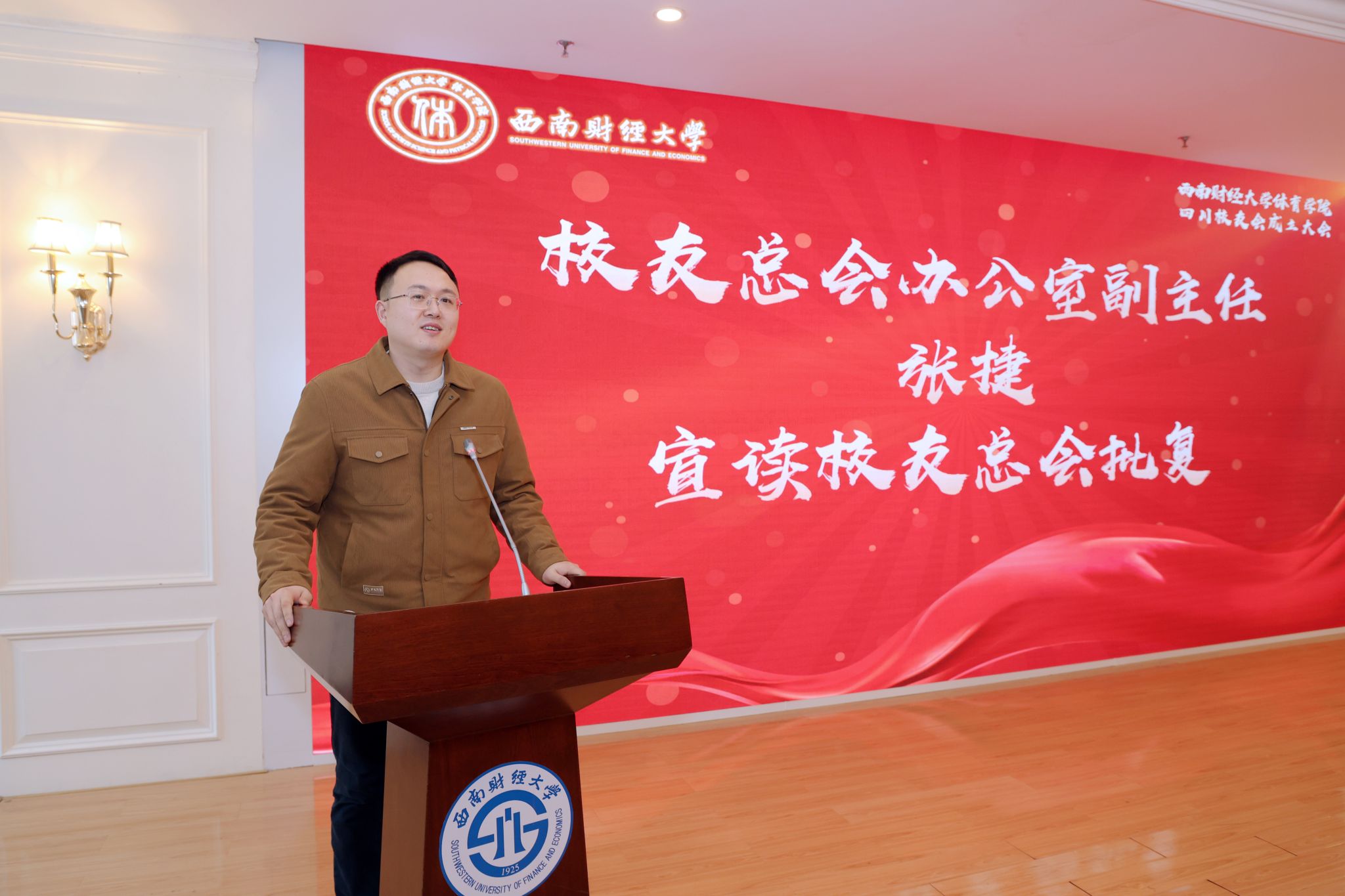 张捷宣读学校校友总会批复,为完美体育在线(中国)唯一官方网站四川校友会授牌,向完美体育在线(中国)唯一官方网站四川校友会的成立致以热烈祝贺。