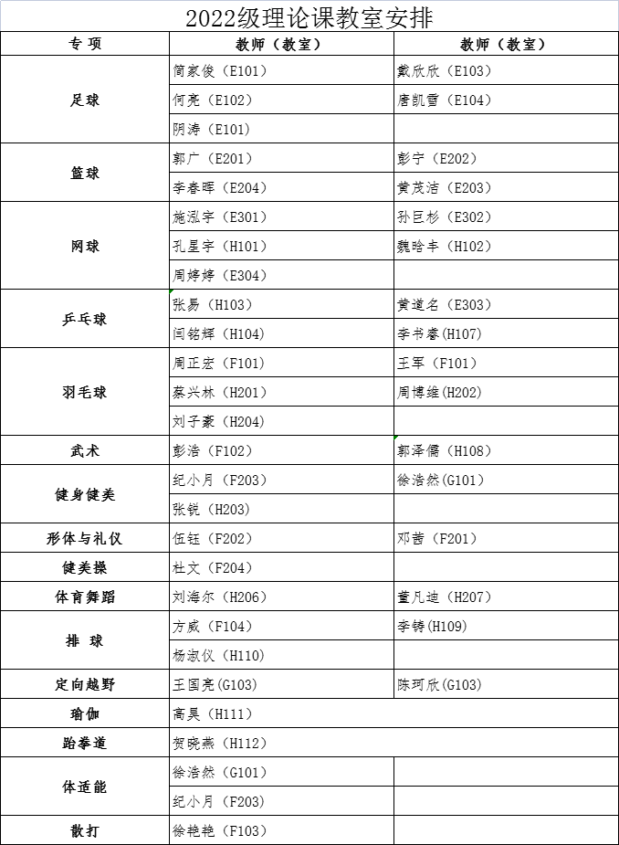 各学院: 经教务处同意,本学期2022级本科生第1周体育课为完美体育在线(中国)唯一官方网站理论课,9月18日起恢复户外教学。根据教室资源状况,现将理论课具体安排通知如下: