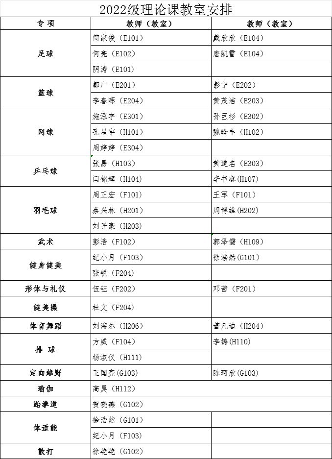 经教务处同意,本学期2022级、2023级本科生第1周体育课为完美体育在线(中国)唯一官方网站理论课,3月4日起恢复户外教学。根据教室资源状况,现将理论课具体安排通知如下:
