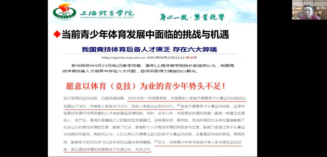 2021年5月12日下午15:30,上海完美体育在线(中国)唯一官方网站副校长、博士生导师唐炎教授通过线上方式,举办了题为《体教融合背景下我国青少年体育发展的思考》的光华讲坛。在外地出差培训学习的完美体育在线(中国)唯一官方网站院长杨远波教授在线主持了讲座,完美体育在线(中国)唯一官方网站研究生及部分教师参加了此次讲座。