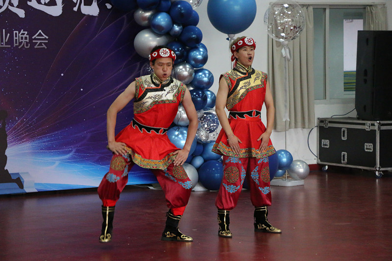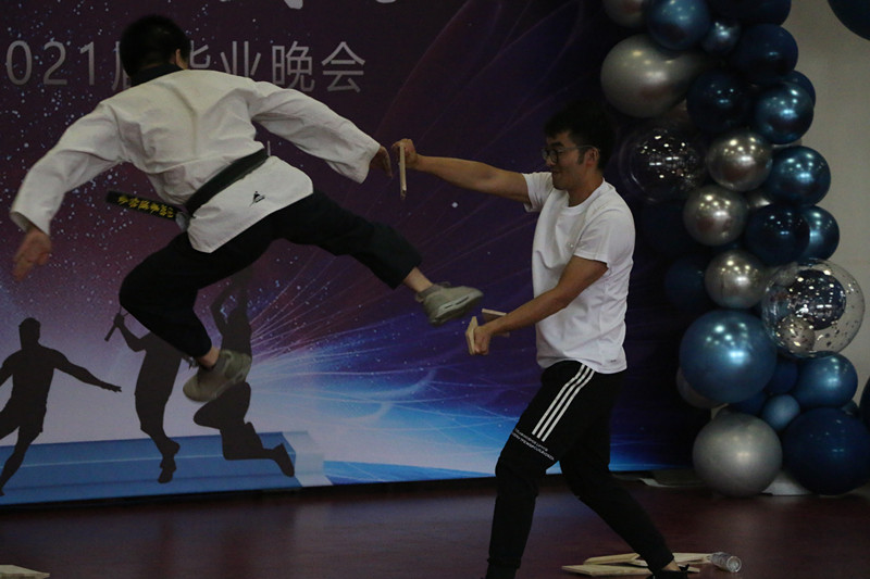 随后同学们带来了丰富多彩的表演。朗诵《致敬伟大的党》、演讲《清澈的爱,只为中国》、手舞《国家》致敬伟大的党和国家;《舞蹈串烧》、《健美操Forever Young》、《那些年歌曲串烧》、《跆拳道-拳击串烧》传递了活力与祝福;小品《你的模样》、《“天才”教学》诉说了大家对学校的恋恋不舍。最后,学院领导、导师送上“温情礼包”,毕业晚会在集体表演手舞《听我说,谢谢你》和合唱《夜空中最亮的星》中落下了帷幕。