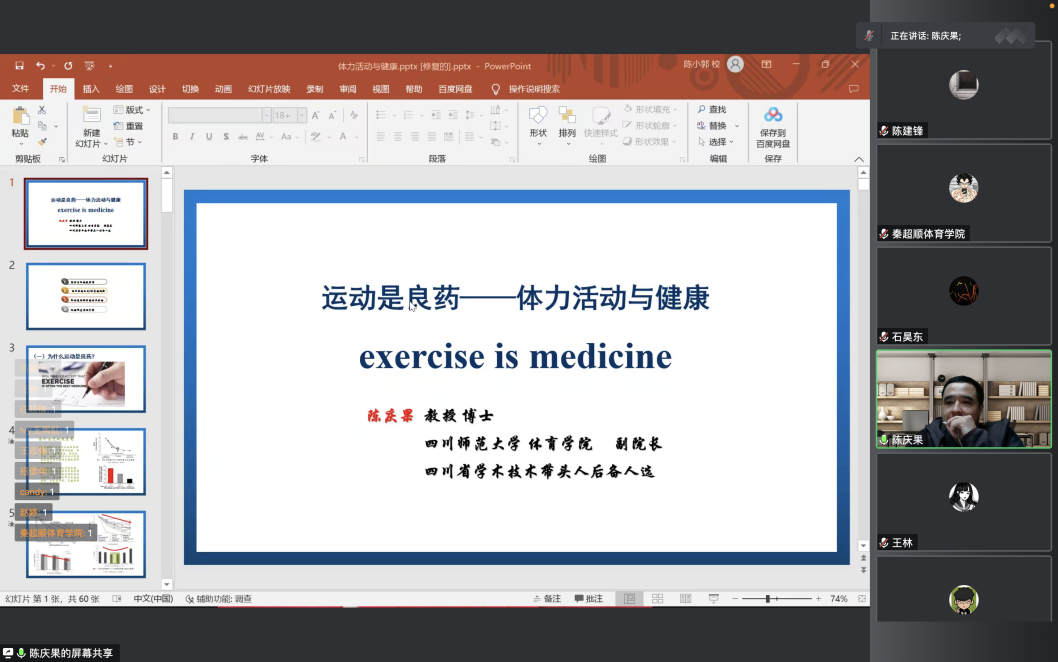 2022年11月10日,四川师范大学完美体育在线(中国)唯一官方网站副院长陈庆果教授在线上举办了题为《再谈运动与健康:运动是良医》的光华讲坛,完美体育在线(中国)唯一官方网站副院长陈丛刊主持本次讲座,完美体育在线(中国)唯一官方网站研究生、部分教师以及校内外师生等共计60余人参加了此次讲座。